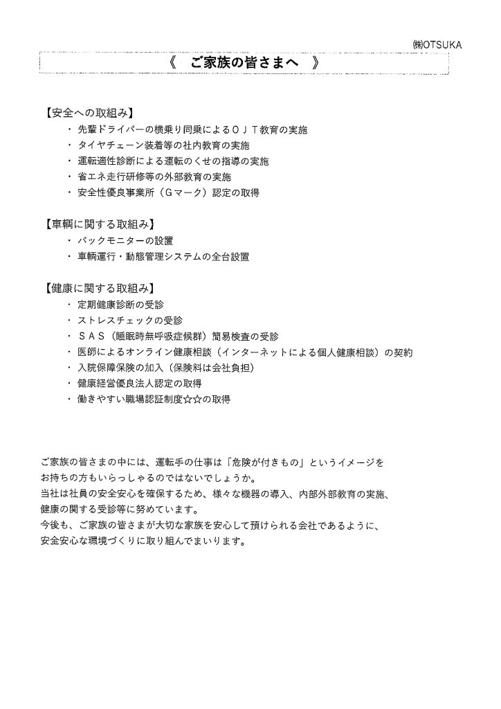 ご家族の皆さまの中には、運転手の仕事は「危険は付きもの」というイメージをお持ちの方もいらっしゃるのではないでしょうか。当社の取組みをお読みいただきまして、少しでも安心して大切な方を送り出していただきたいと思います。